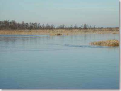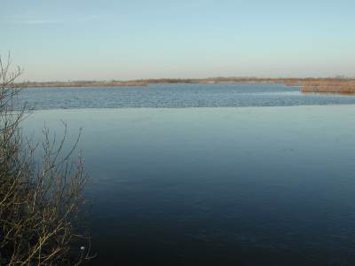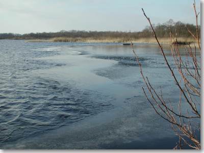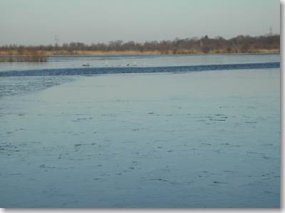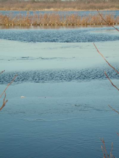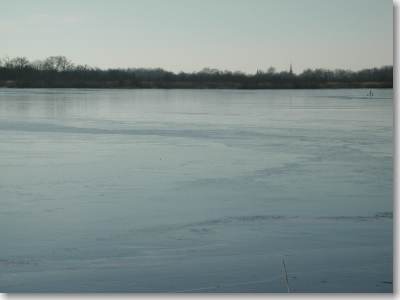 Precies op de rand van wat gisteren nog open lag, zichtbaar als streep van links naar het eilandje rechts in het midden van de foto, trof ik het eerst wak aan (bij het eilandje). Van andere schaatsers hoorde ik van meerdere wakken. (I.v.m. eigen veiligheid kon ik niet dichterbij komen). |