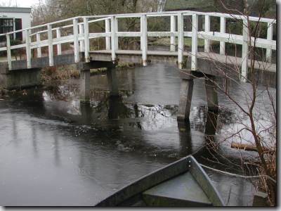 Googpad halverwege bij de brug. Hier en achter deze brug ligt het nog open. De eerste 100 meter na de brug zijn verraderlijk dun: er liggen zelfs kleine gaatjes open. Ik vermoed dat dat is veroorzaakt door het opstuwende water rechts van de brug.