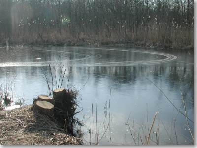 Een fraai voorbeeld hoe verraderlijk het ijs kan zijn als het helemaal dicht ligt. Van beneden naar boven vindt u ijs, water, ijs, water, ijs, rietkraag, ijs en water. Het geven van ijsdiktes is dan ook altijd een hachelijke zaak. |