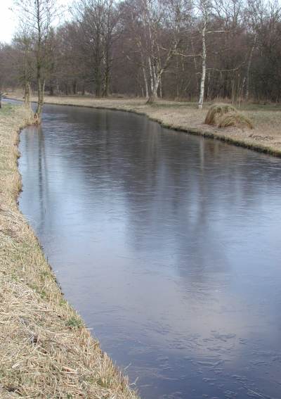 De sloot aan de linkerkant van het Bergse Pad ligt al helemaal dicht. De geschatte dikte van het ijslaagje (na onderzoek aan de kanten) schat ik op 2 à 2,5 cm.