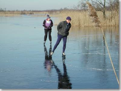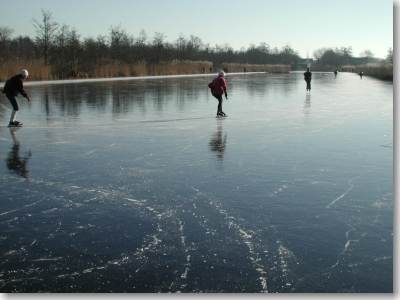Deze vorstperiode was ook voor mij met een 25-jarige 'Ankeveen-ervaring' een bijzondere. Niet eerder heb ik een periode meegemaakt waarin het 's nachts zo koud was en overdag zo warm met een intens stralende zon. Er is natuurlijk vaker geschaatst met temperaturen dik boven nul, maar dan lag er wel een stevige ijsvloer. En nu moest de ijsvloer gevormd worden tijdens nachtelijke vorst en dagelijkse + temperaturen met veel zon. De zon was de afgelopen periode de grote boosdoener. Deze zendt een deel van zijn stralen dwars door het ijs naar de ondiepe, zwarte bodem. De zwarte bodem absorbeert die straling graag en wordt verwarmd. Het daarboven staande ondiepe water wordt eveneens verwarmd en breekt af wat 's nachts is aangegroeid. Waar de ondiepte helpt met het snel vormen van een ijslaag, werkt deze tegen bij de al sterke zonnestraling van eind februari. De onderstaande foto's van vandaag zijn de laatste welke ik deze vorstperiode heb genomen. Het was vandaag al zeer riskant; morgen zal door de sterke inwerking van de zon van vandaag en de te verwachten lichte vorst van komende nacht de situatie slechts verslechterd zijn. |