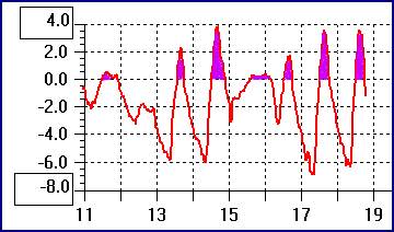 Hoge dagtemperaturenLinks ziet u een grafiek van de huidige vorstperiode tot 18-02-2003 19.00 uur. De naam vorstperiode is niet echt op zijn plaats: alleen woensdag was een echte ijsdag (de hele dag de temperatuur onder nul). U ziet in paars het behoorlijke deel dat de temperatuur boven nul was. |