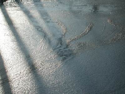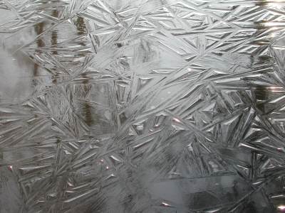 Het schaatsen is niet alleen verantwoordelijk voor de schoonheid van de vorst. De natuur ordent prachtige structuren in het ijs. Deze en de volgende twee foto's zijn gemaakt van het ijs in de sloot aan de linkerkant van het Bergse Pad. |