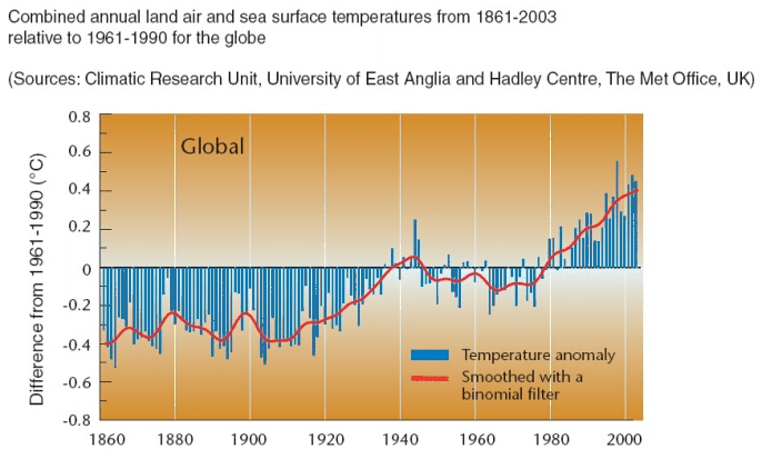 De wereldgemiddelde temperatuur over 2003 komt naar schatting uit op een afwijking van +0,45 graden boven het langjarig gemiddelde. Dat meldt de Wereld Meteorologische Organisatie (WMO) in haar jaaroverzicht van het weer in de wereld. Met deze afwijking komt 2003 op de derde plaats van de warmste jaren sinds het begin van de metingen in 1861. Nog warmer waren 2002 (+0,48 graden) en het warmste jaar in de meetreeks blijft 1998 (+0,55 graden). |