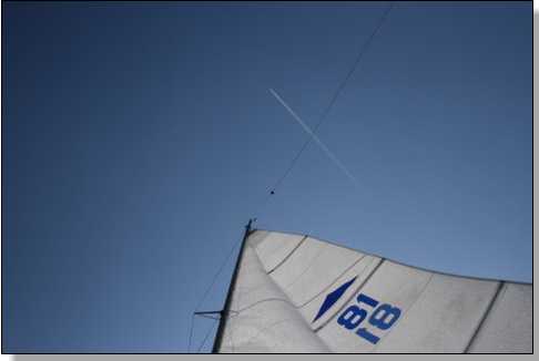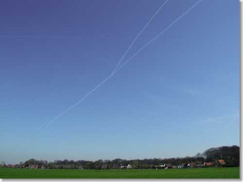 foto: Ruud schrijft: "Ik werd vooral getriggerd om deze foto te maken door het vliegtuig-spoor in de lucht, dat zich plotseling in tweeën lijkt te splitsen. De oplossing van het "raadsel" is een stukje verderop op de foto te zien; zij het wat vaag, komen twee sporen samen." |