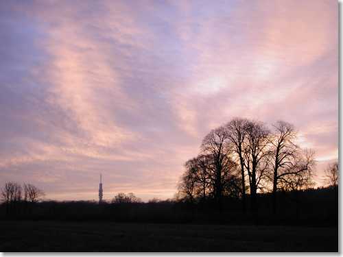 Vlak voor zonsopkomst; zicht vanaf bezoekerscentrum 's-Graveland op de lucht boven Hilversum met televisietoren. |