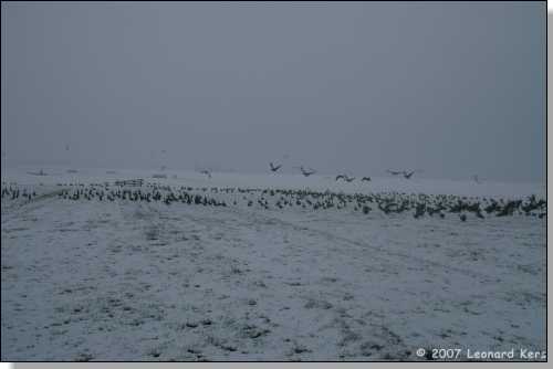 foto: Leonard Kers Sneeuw "Invallende duisternis, besneeuwde weilanden en ganzen die bij elkaar beschutting zoeken. De grijze kleuren met de donkere gestalten van de vogels maken duidelijk dat sneeuw niet alleen maar pret is." (L.K.) |
