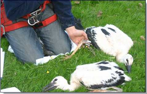 foto: Ariejan Groenewegen Ooievaars geringd "Vanavond zijn de jonge ooievaars die aan de Stichtsekade op het nest zitten geringd. Dat is een helse klus want dan moet je eerst met een ladder naar boven, om vervolgens de jonge ooievaars uit het nest te halen en naar beneden te brengen. " (A.G.) |