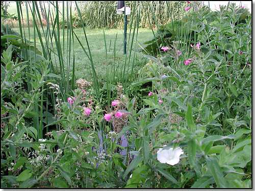 foto: Het harig wilgeroosje (rose) staat volop in bloei langs de sloot in de tuin van weerstation De Arend. De akkerwinde (wit) ziet u rechtsonder. Midden boven ziet u een meeteenheid van het weerstation. |