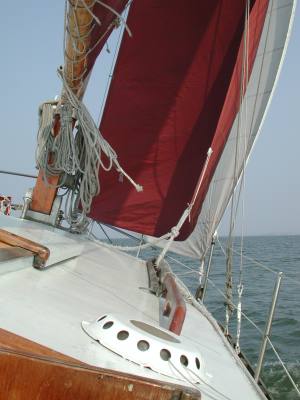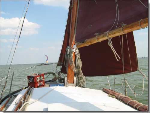 Een dag later konden we door de matige wind het waterzeil (een oude fok onder de giek) goed gebruiken. 13-04-2003 |
