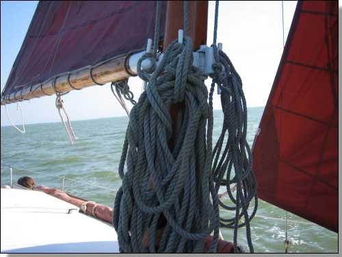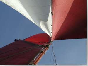 van de zeilen. U ziet linksonder het grootzeil, daarboven het afzonderlijk gehesen gaffeltopzeil, het witte zeil is de kluiver en rechtsboven is de fok. 11-04-2003 |