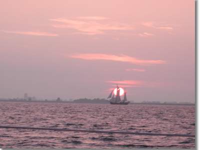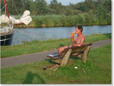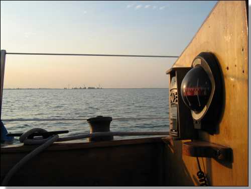 6 augustus 2003 om 21.06 uur voor anker op het Slotermeer in Friesland. Weerstation De Arend mat op dat moment een temperatuur van 27.3 graden en een wind van 3.1 m/sec. uit het zuiden. |
